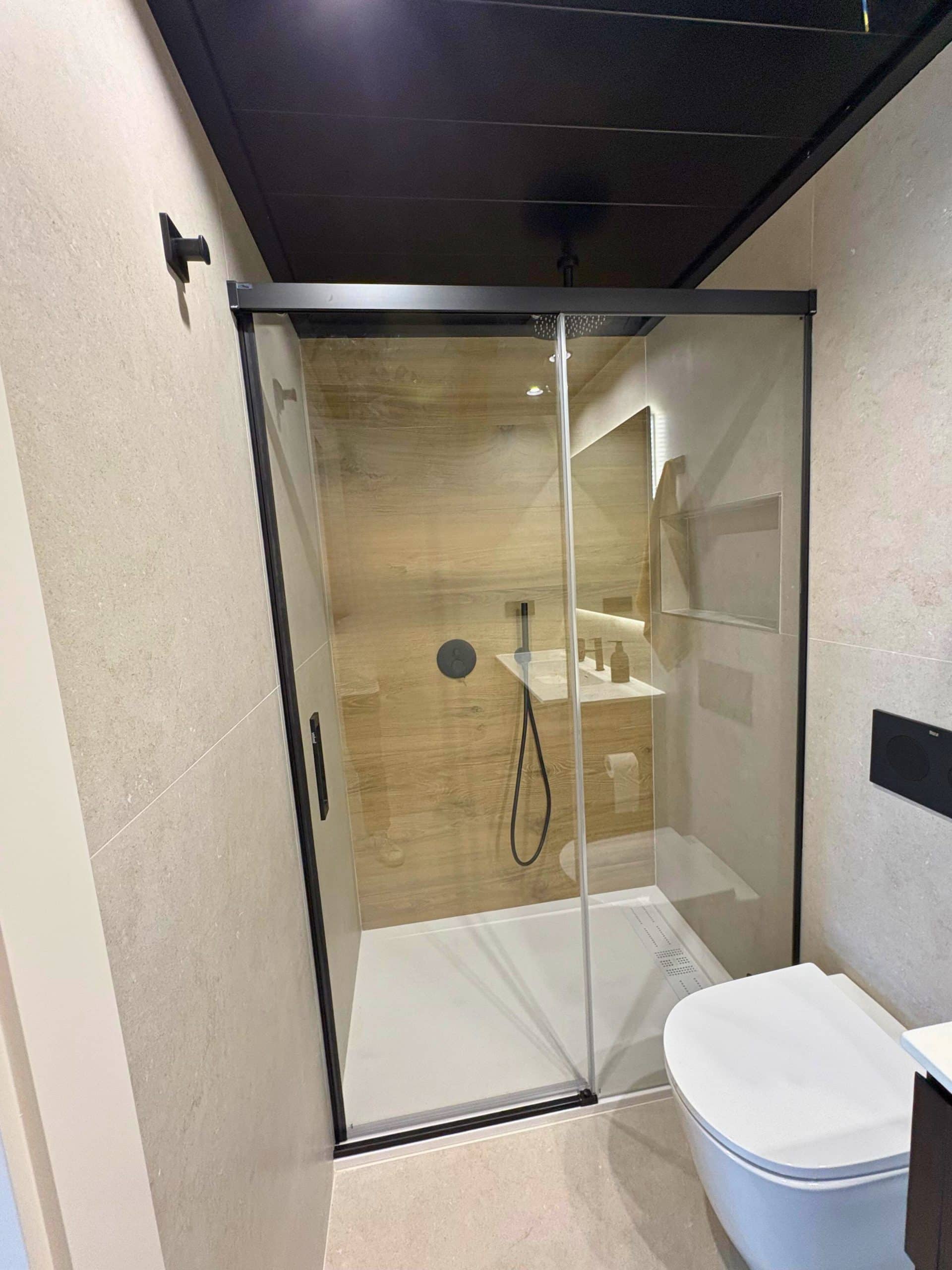 La zona de ducha, con mampara de perfilería negra y revestimiento efecto madera, aporta un toque natural y acogedor, mientras que el techo negro con iluminación empotrada refuerza el estilo del conjunto. Los revestimientos cerámicos en tonos piedra unifican el espacio y facilitan la limpieza y el mantenimiento diario.